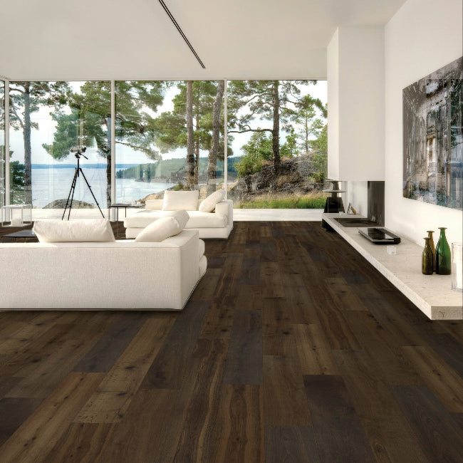 The True collection is truly amazing with stunning colors and features. Hallmark Floors is the first to master this revolutionary technology of replicating “the bog-wood process” that occurs when logs lie buried in lakes, river, and waterways for hundreds of years, deprived of oxygen and sunlight. This process in nature can take centuries for the wood to turn from its natural color to deep golden brown or even completely black. Hallmark has emulated nature’s methods to create saturated colors throughout the top layer, creating stunning, weathered patinas. True bog-wood, driftwood, and weathered barn wood are all very rare. These cherished wood treasures are in high demand worldwide for use in furniture and flooring. Now Hallmark has made these prized finishes available to everyone through our True hardwood flooring collection.