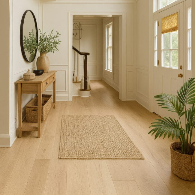 This Muller Graff premium oak flooring delivers substantial 15mm thickness and a generous 9 1/2 inch width, offering an impressive presence in any room and supporting a long lasting surface underfoot.